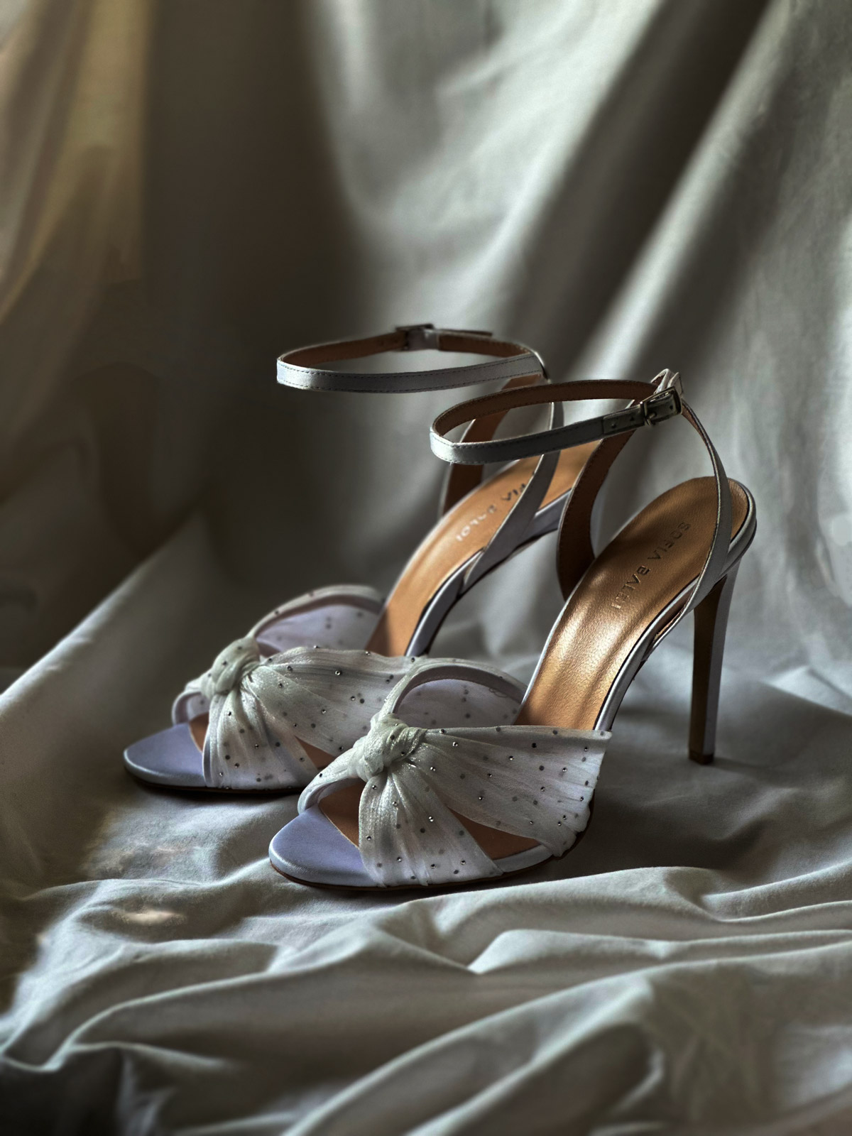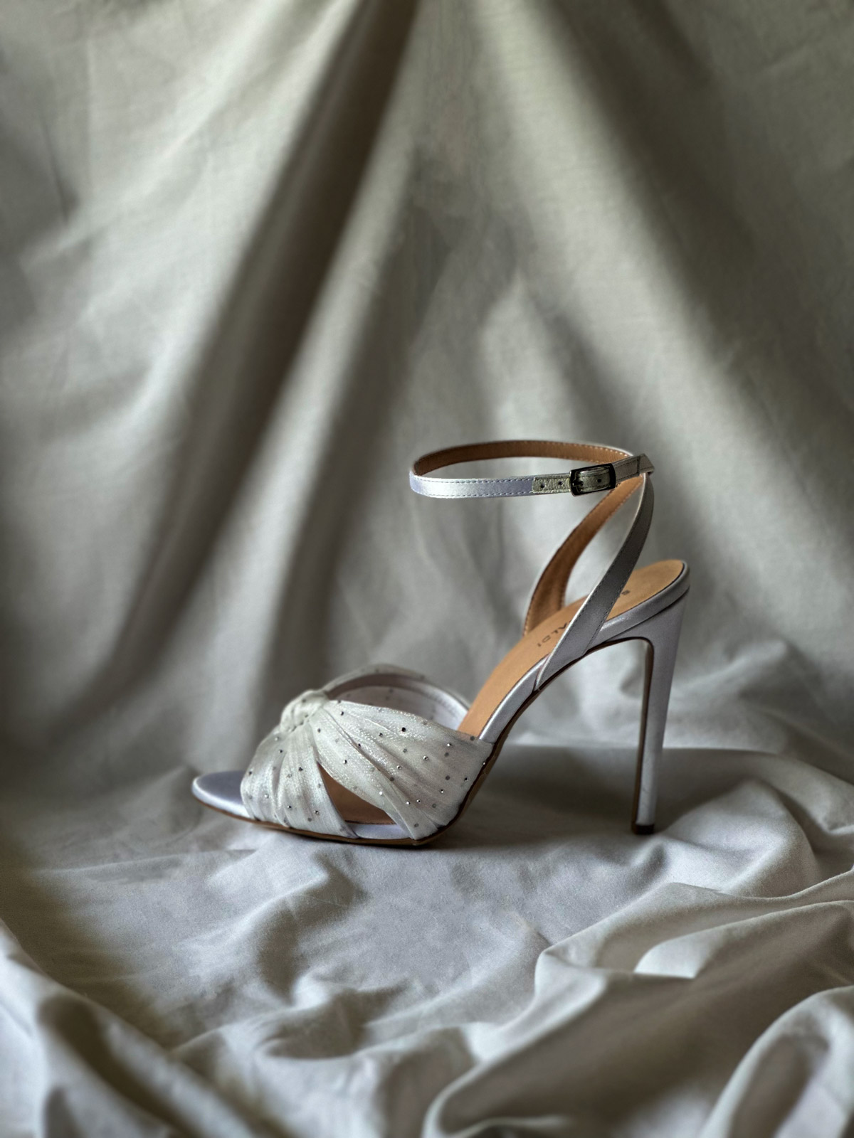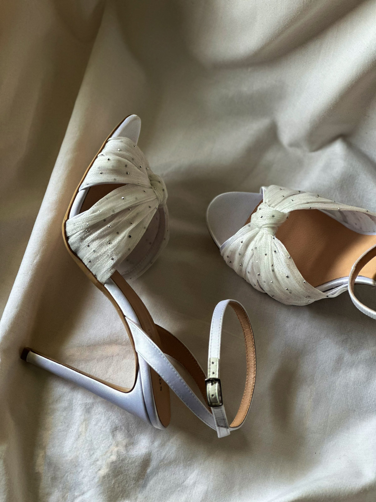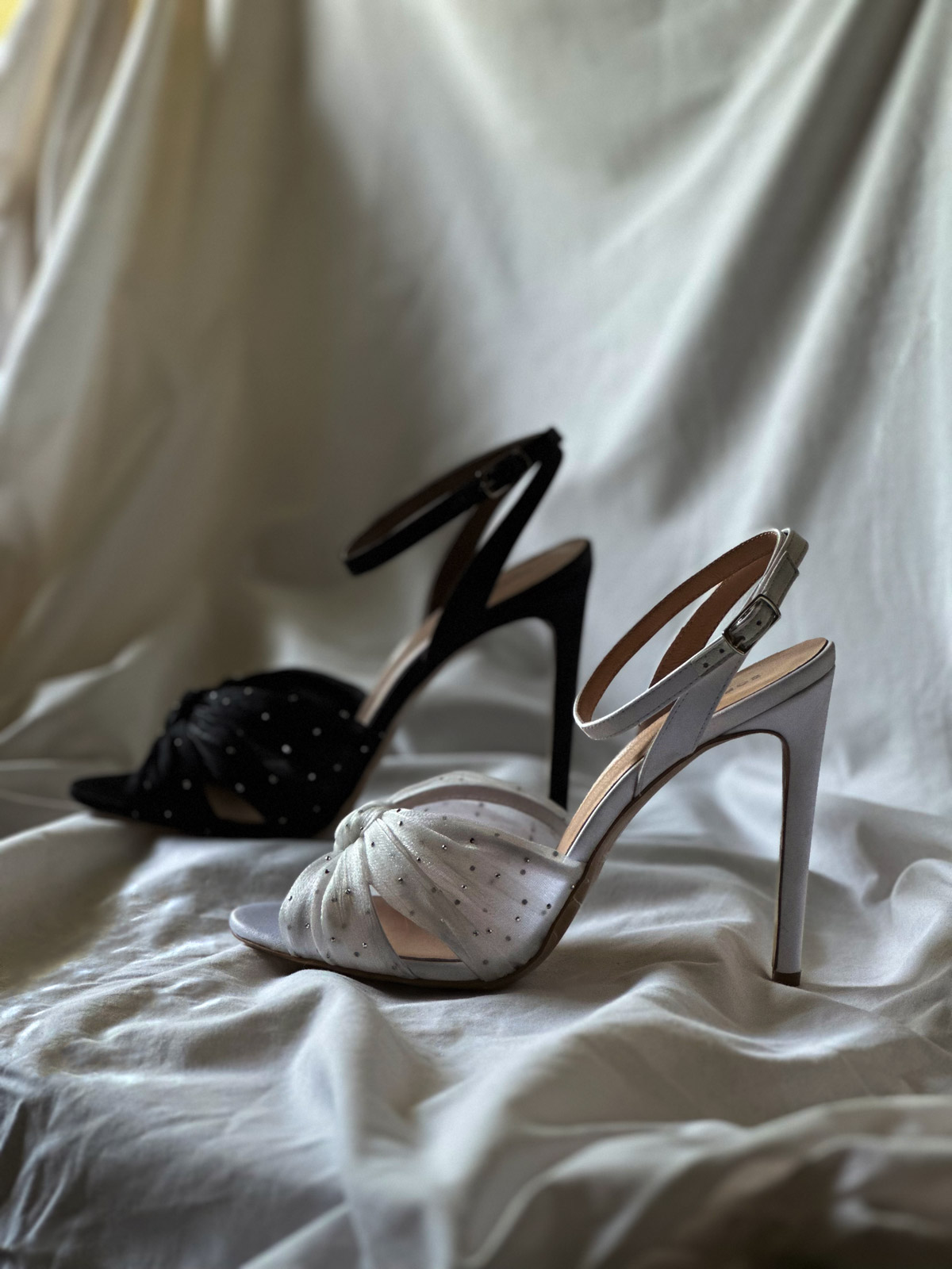 Prepoznatljiva silueta sa elegantno preklopljenim kaiševima i suptilnim sjajem cirkona. Crna varijanta za dramatične večeri, dok bela satenska nijansa donosi sofisticiran sjaj savršen za bridal trenutke i svečane prilike.